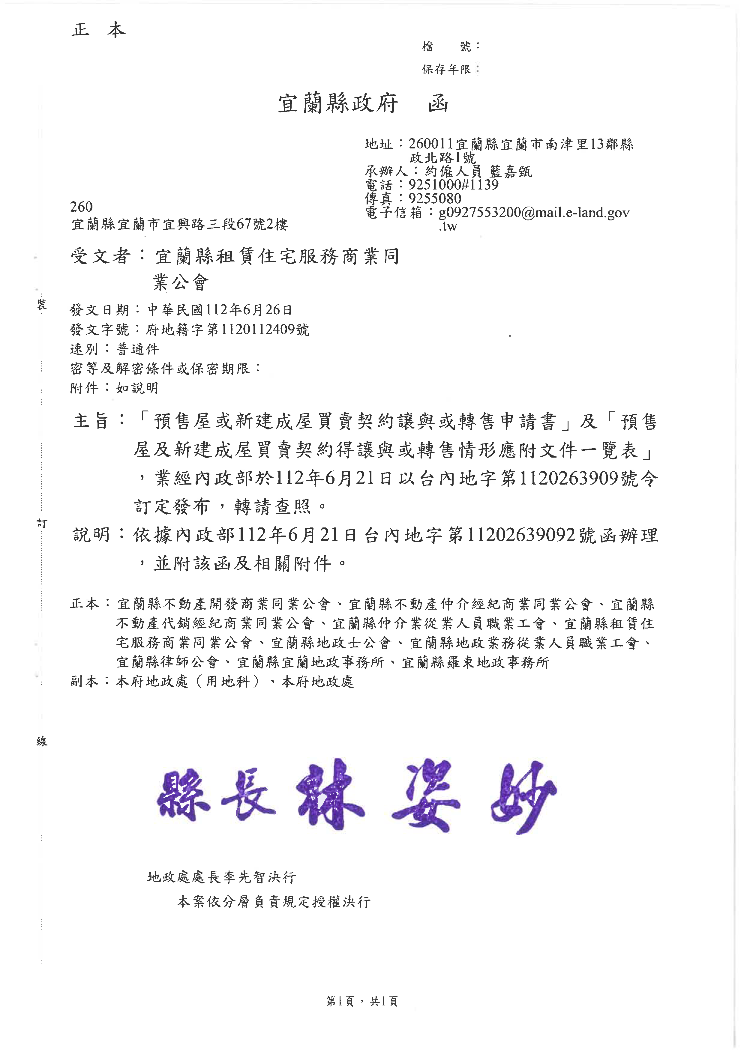 宜蘭縣政府公文:「預售屋或新建成屋買賣契約讓與或轉售申請書及讓與或轉售情形應附文件一覽表」,業經內政部於112年6月21日以台內地字第1120263909號令訂定發布,轉請查照。